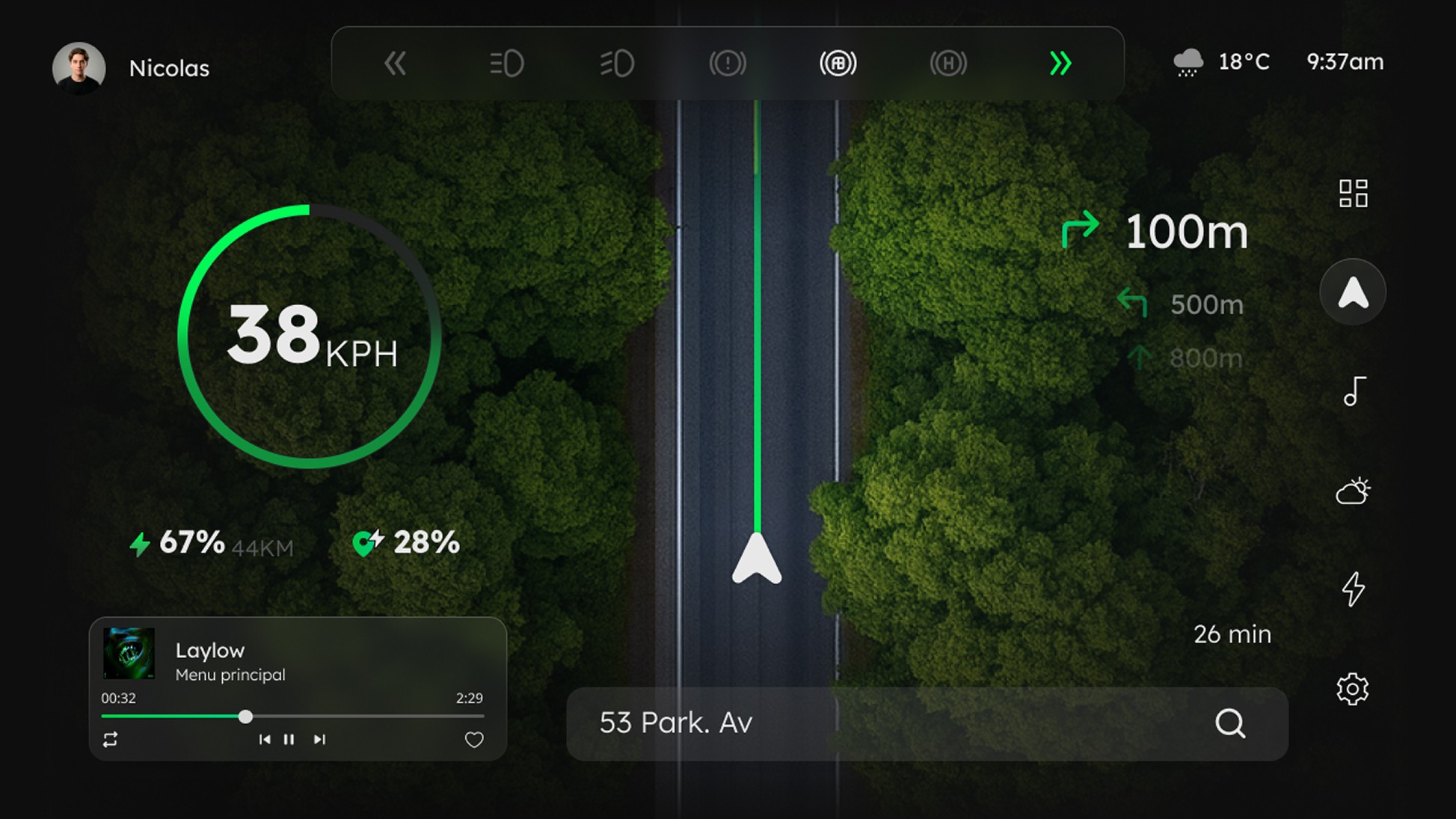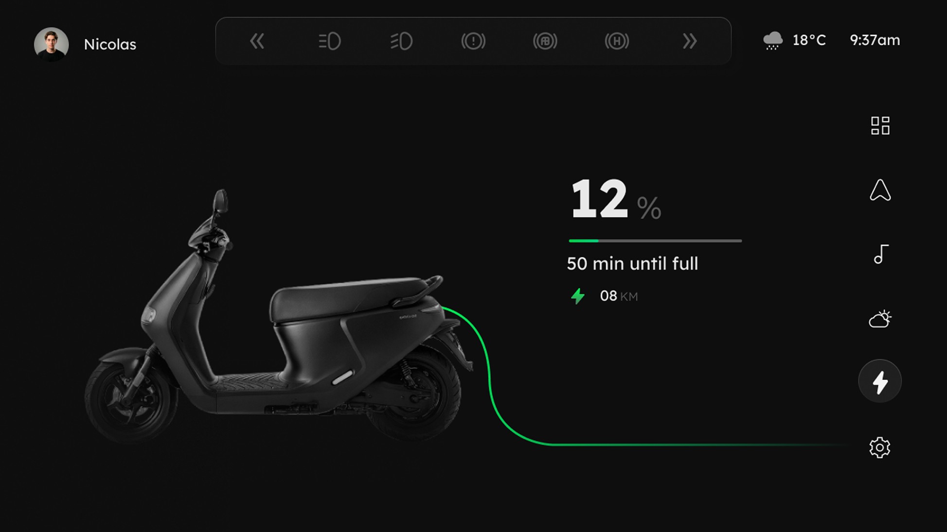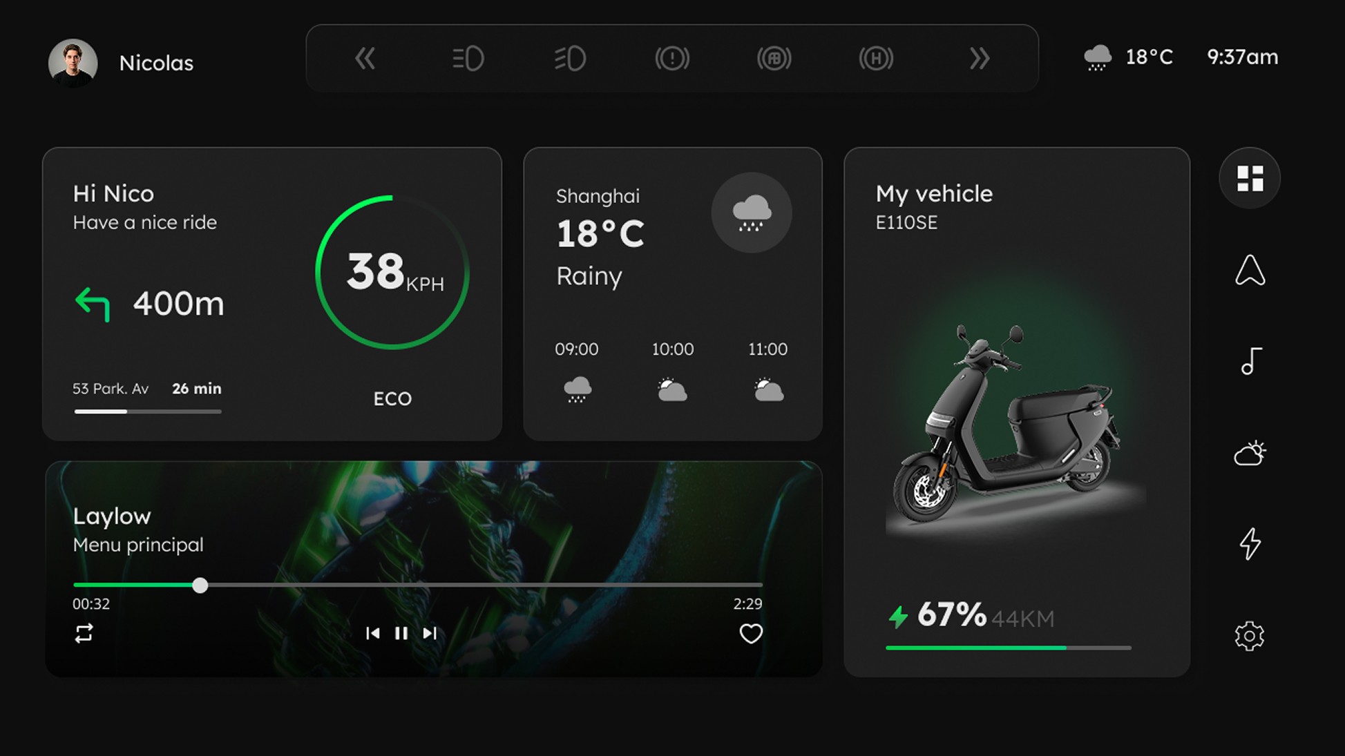 This concept explores a unified digital cluster for electric scooters. Tailored for urban commuting, the dashboard prioritizes legibility and visual comfort. It elevates the ride by integrating customizable widgets for a truly personalized experience.