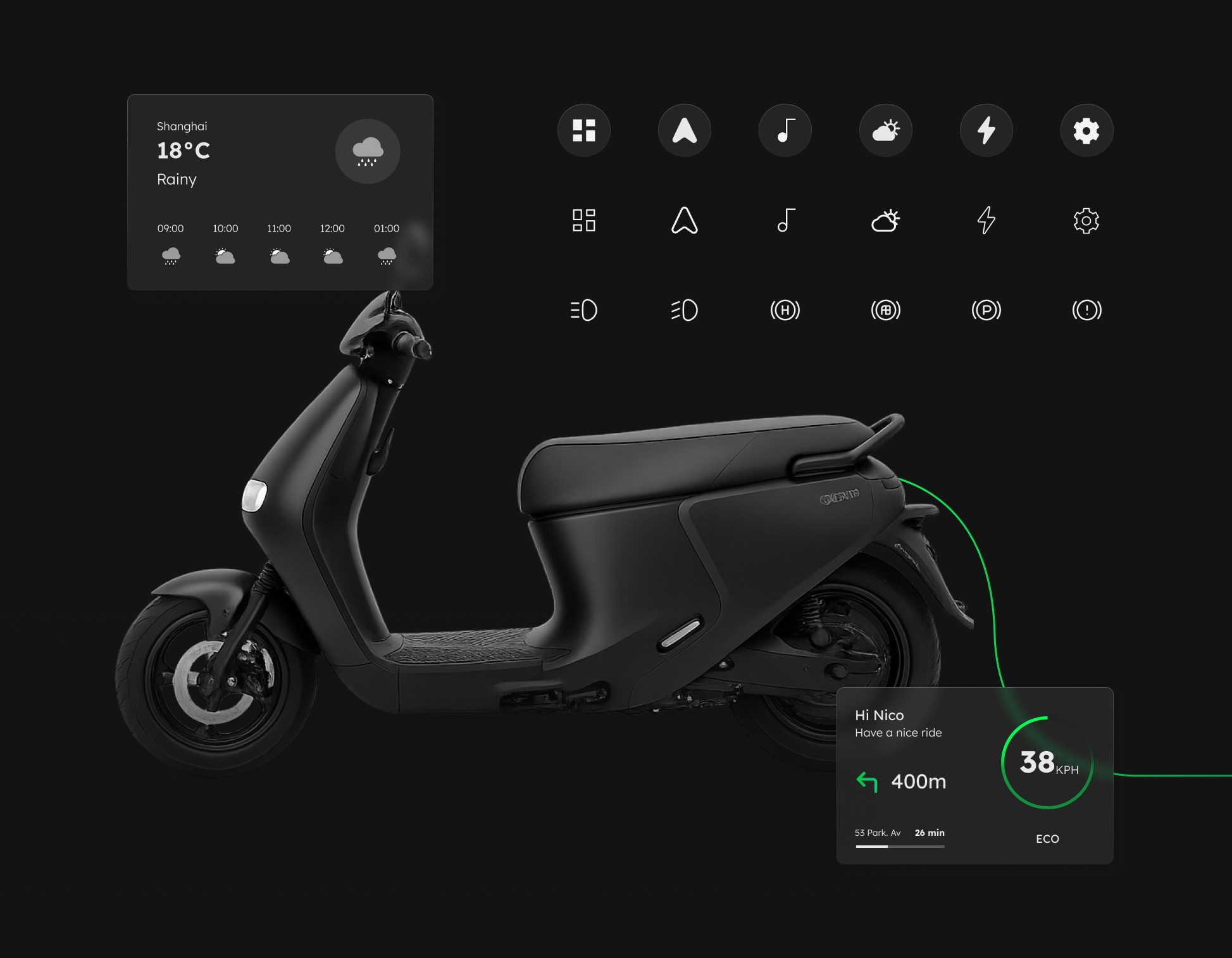 Designed for instant readability, the system pairs a rounded sans-serif with tabular figures to stabilize moving data. The palette uses a high-contrast dark theme to reduce glare, energized by neon green accents that embody the scooter’s electric performance.